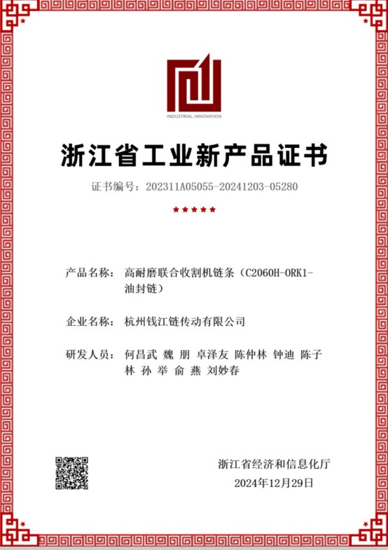 For å løse disse problemene utviklet selskapet "High Wear-Resistance Combined Harvester Chain C2060H-ORK1 Oil-Sealed Chain". Ved å optimalisere kjedestrukturdesignet, bruke høykvalitets legert konstruksjonsstål, ta i bruk CNC kompositt presisjonsstemplingsteknologi og varmebehandling av isotermisk bråkjølingsprosess, styrkes og overflatehardheten til kjedekomponentene forbedres, tetningsytelsen til smøreolje for inngripende deler forbedres, korrosjonsmotstanden økes og levetiden forlenges.