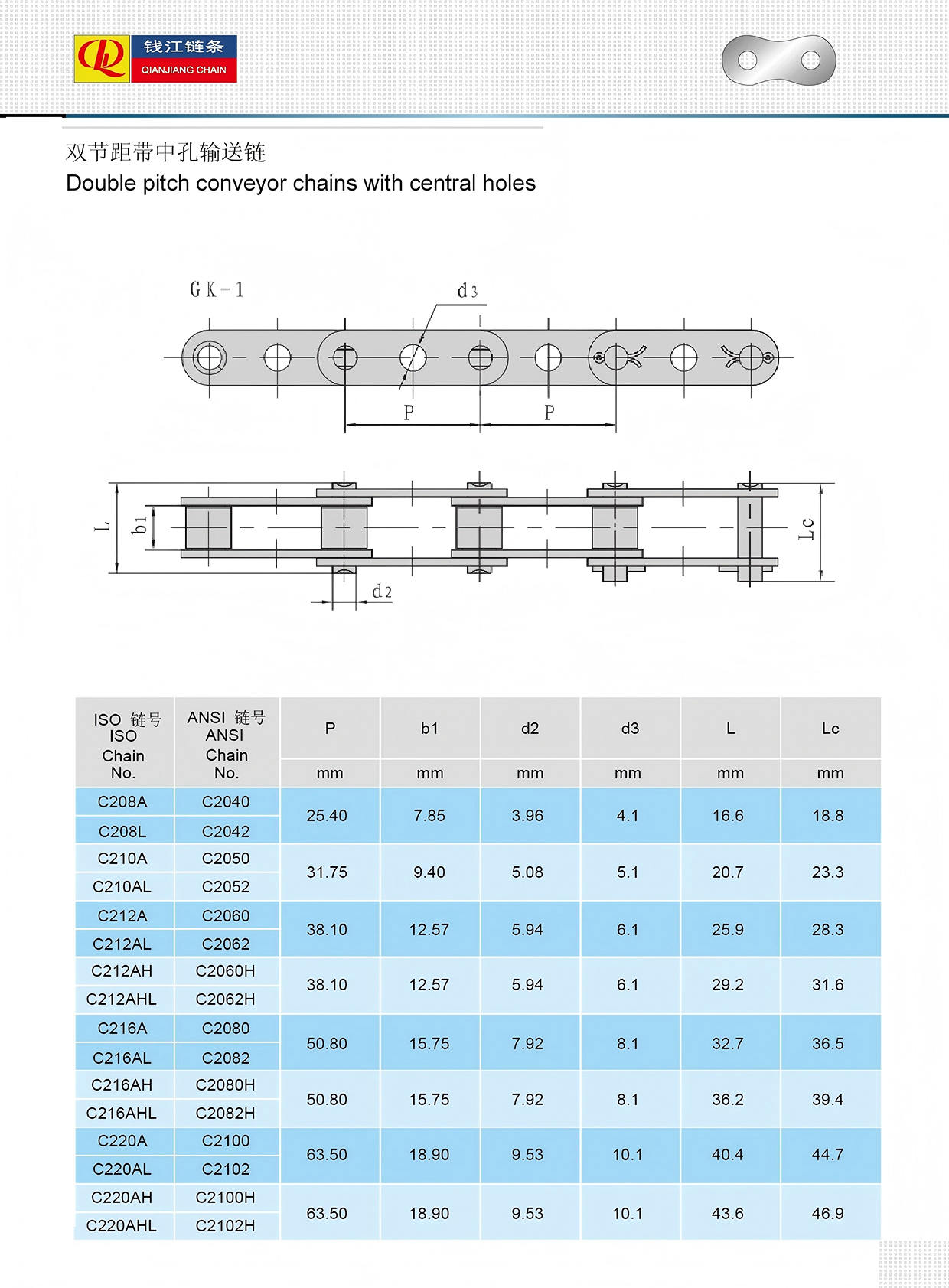 Doble transportbåndkjeder med sentrale hull